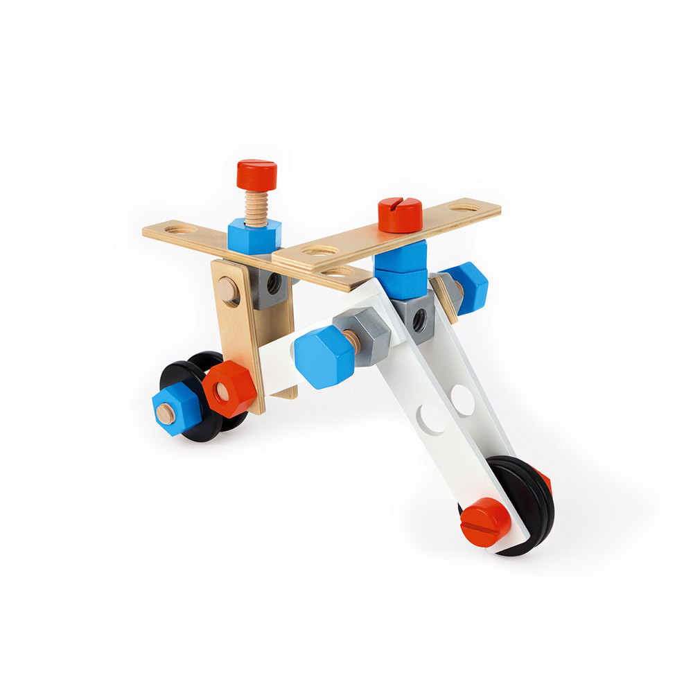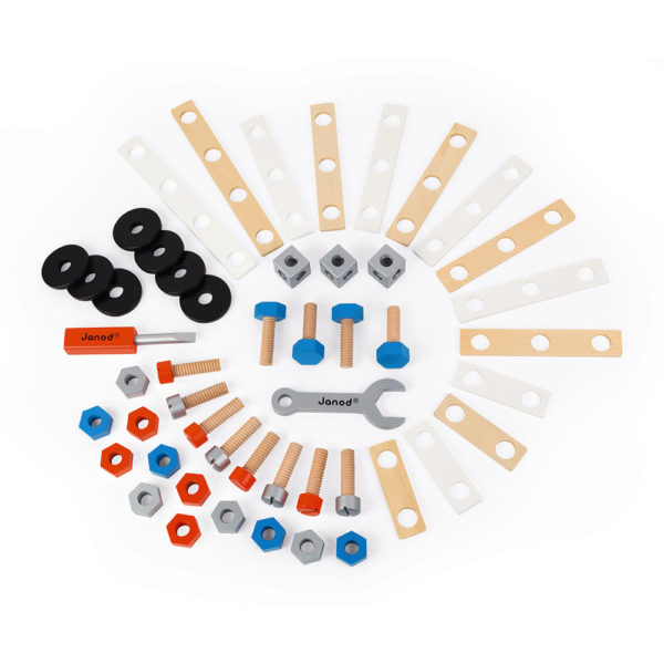C’est parti pour l’invention du siècle ! Les petits bricoleurs et inventeurs dès 3 ans seront ravis de pouvoir explorer leur imagination au maximum avec ce baril d’accessoires en bois ! Vos enfants vont pouvoir construire les engins les plus fous, les outils les plus farfelus et pourquoi pas trouver leur vocation ! Seul ou entre amis, les concours de créations vont aller bon train ! Il pourront donner vie à de multiples constructions : avion, moto … Ce jeu contient 50 accessoires : 7 rondelles + 2 plaquettes avec 4 trous + 8 plaquettes avec 3 trous + 4 plaquettes avec 2 trous + 12 écrous hexagonaux + 3 écrous cubiques + 4 boulons + 8 vis + 1 tournevis + 1 clé.