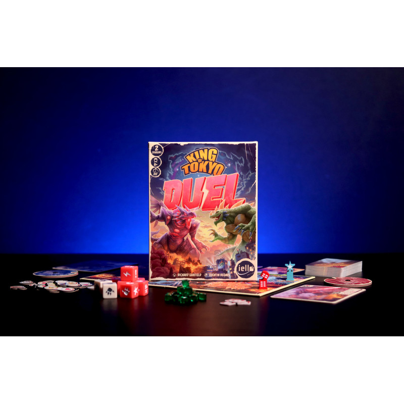 Dans King of Tokyo: Duel, chaque joueur incarne un monstre redoutable doté d’un pouvoir unique et se lance dans un combat acharné pour devenir le maître de Tokyo. Le jeu se déroule sur un plateau à deux pistes représentant la Gloire et la Destruction. À chaque tour, les joueurs lancent des dés pour réaliser des actions telles que baffer son adversaire, se soigner, accumuler de l’énergie ou acheter des cartes offrant de nombreux pouvoirs. Ces cartes offrent des avantages stratégiques supplémentaires et permettent de personnaliser son monstre pour surprendre l’adversaire.