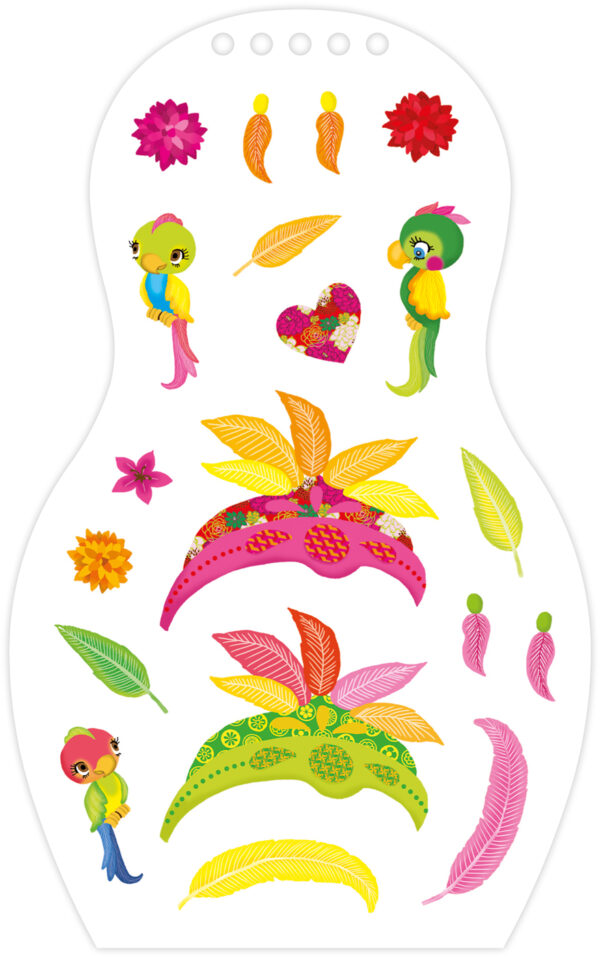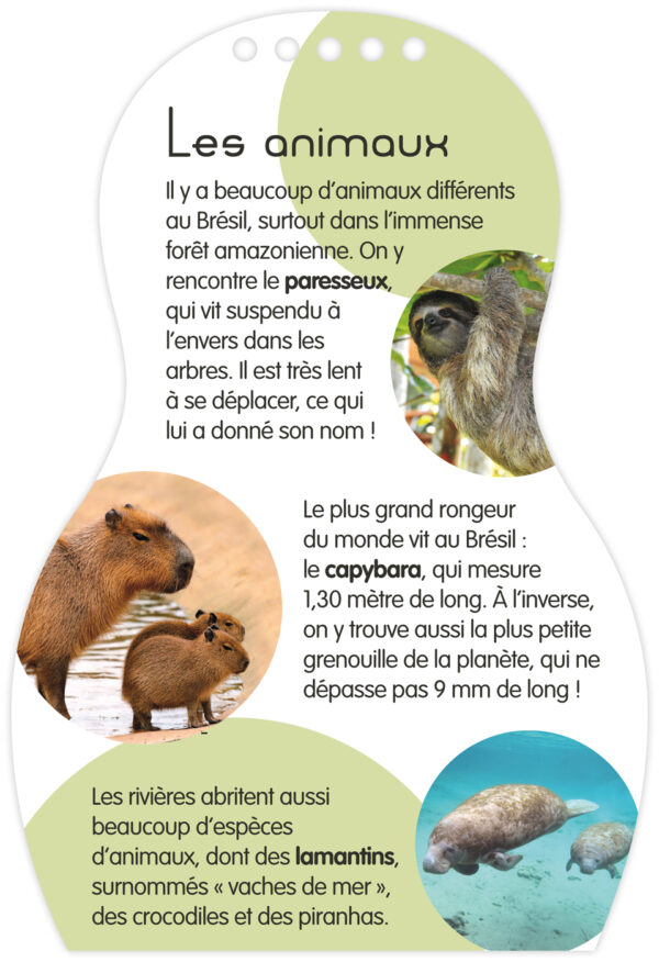 Et en plus, des infos documentaires sur les traditions et les tenues du Brésil : les vêtements, le carnaval de Rio, l’école, les bracelets brésiliens, l’alimentation, les animaux.