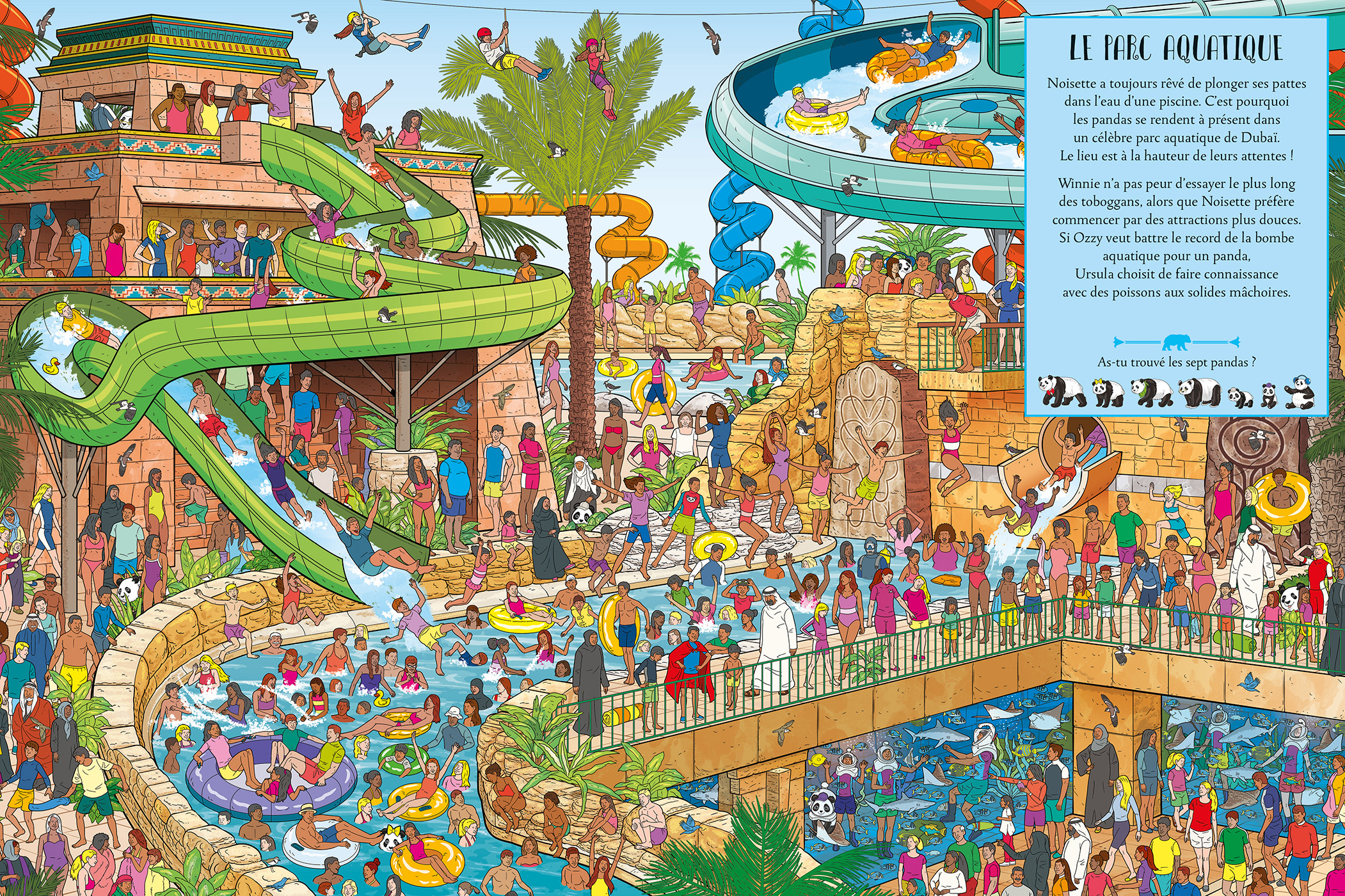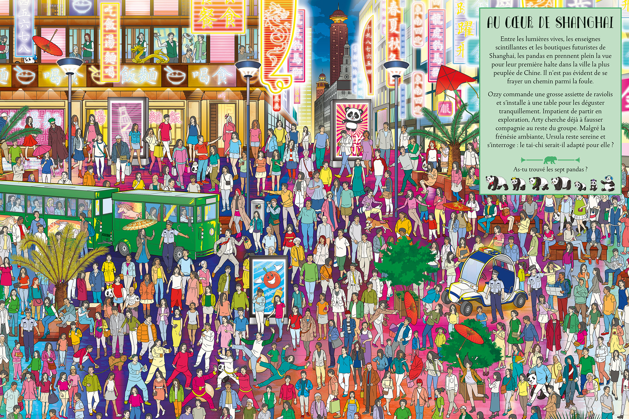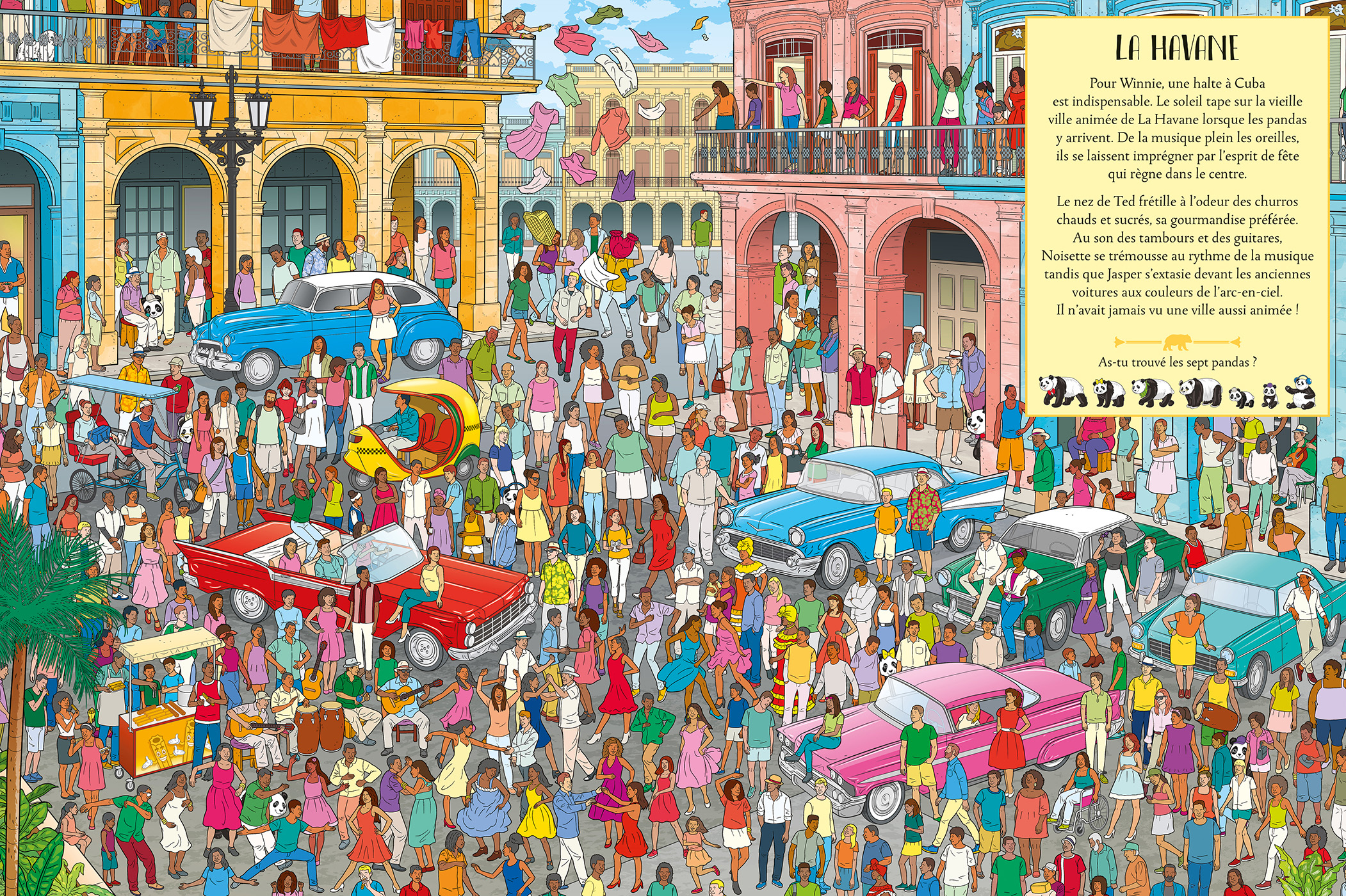 Un matin dans une forêt de bambous, le quotidien tranquille des pandas est chamboulé… C’est parti pour l’aventure ! Accompagne-les dans ce périple autour du monde, et découvre avec eux l’effervescence d’une gare au pied de l’Himalaya, une plage animée en Nouvelle-Zélande, en passant par un magnifique marché aux fleurs aux Pays-Bas. Sauras-tu les retrouver dans chacune des 17 scènes du livre ? Ils sont malins et joueurs, alors ouvre l’oeil !