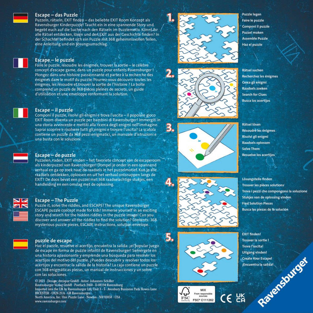 Découvrez la première offre de puzzles inspirée des jeux d’évasion, adaptée aux enfants dès 9 ans ! Une fois que les 368 pièces du puzzle sont assemblées, les enfants plongent dans un univers plein de mystère et d’énigmes à résoudre. En observant attentivement l’illustration, ils pourront débusquer les indices et mettre à l’épreuve leurs sens de la déduction. Au fil des énigmes, les enfants récolteront des pièces du puzzle, qui leur permettront de reconstituer la solution finale, comme clef de sortie de ce grand jeu d’évasion.