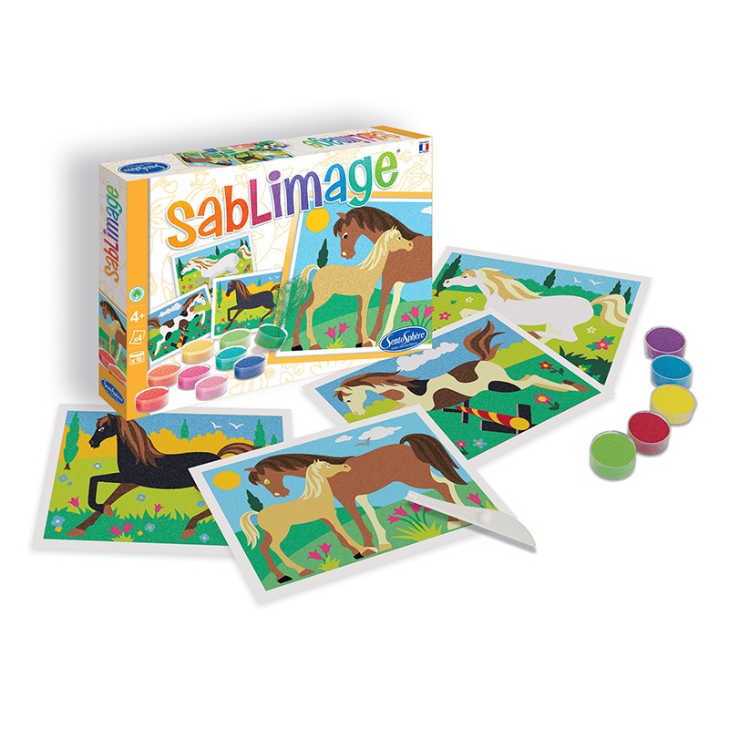 Donnez vie à ces 4 magnifiques chevaux en les réhaussant de couleurs leurs robes grâce aux sables multicolores du coffret.